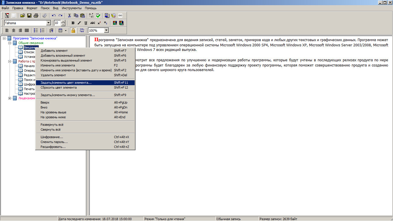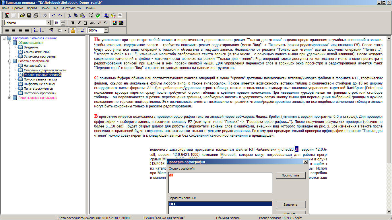 Для хранения информации в программе "Записная книжка" используется комбинация популярных форматов данных: XML и RTF. Файл документа программы имеет расширение *.ntb - Вы сможете включить регистрацию этого типа расширения для открытия таких файлов в программе на своём компьютере. Программа не использует реестр операционной системы для хранения собственных настроек и не содержит каких-либо скрытых рекламных модулей, троянов или вирусных функций. Имеется возможность импорта/вставки документов в формате RTF, графических файлов типа JPEG, PNG, BMP, EMF, WMF, а также гиперссылок. В программе есть поддержка шифрования как отдельных записей, так и всего файла данных целиком.